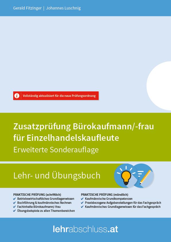 Der Teil Buchhaltung und Jahresabschluss dieses Buches baut bereits auf das Basiswissen für kaufmännische Lehrabschlüsse in Bezug auf laufende Buchführung bis zur Verbuchung von Rabatten und dem Skonto auf. Sollten Sie keine Grundlagenkenntnisse in Buchhaltung besitzen, dann finden Sie die dazu notwendigen Lehrinhalte im Abschnitt "Rechnungswesen & Buchführung" im Lehrbuch "Kaufmännische Lehrabschlussprüfung - Pflichtfächer Lehrbuch" und dem dazugehörigen Übungsbuch.
